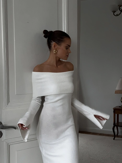Макси платье из трикотажа с открытыми плечами и боковыми вырезами