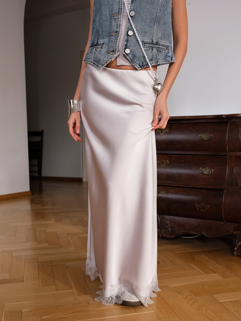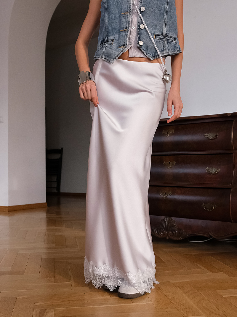 Миди-юбка в бельевом стиле из струящейся, шелковистой ткани. Модель с отделкой по низу тонким кружевом